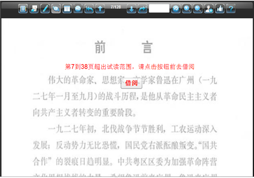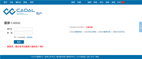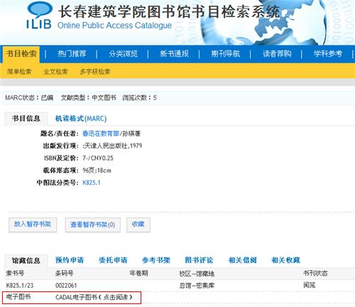 | 关于OPAC与CADAL数字信息资源整合服务使用的通知 | 各位老师、同学们: 图书馆为方便我校师生更好地揭示利用CADAL丰富的数字资源。为全面提高建设数字资源服务体系、提升数字资源总量及利用率,使读者能够浏览使用更多更丰富的多学科、多类型、多语种数字资源,经图书馆努力工作根据已有的数据进行二次应用开发,将CADAL资源与其自有资源进行无缝整合对接,实现了OPAC与CADAL跨资源、跨平台和跨系统的数字资源共享。 资源使用揭示: (一)我校读者在OPAC系统中检索我校图书馆馆藏资源后,如我校有此项纸质资源馆藏及CADAL数字资中有收录该书则会在搜索结果页面中显示电子图书一项,如下图红框内所示: (二)点击CADAL电子图书即可阅读该书在CADAL系统中的电子图书资源,读者需登入在CADAL系统中注册的帐户,如下图所示: 我校已加入并开通CADAL资源的使用权限,未注册的用户登入CADAL立即注册页面按页面提示填写相关资料,完成注册即可。 (三)当在CADAL系统中阅读到一定页数后会提示“超出试读范围,请点击按钮前去借阅”,如下图所示,读者点借阅按钮后即可正常阅读全文。 (四)读者也可直接登入CADAL使用该系统查找我馆目前没有馆藏的纸质书籍的数字资源,并使用包括我的借阅、我的书架、我的评注我的消息、个性化推荐等个性化服务。访问地址:http://www.cadal.zju.edu.cn/index |