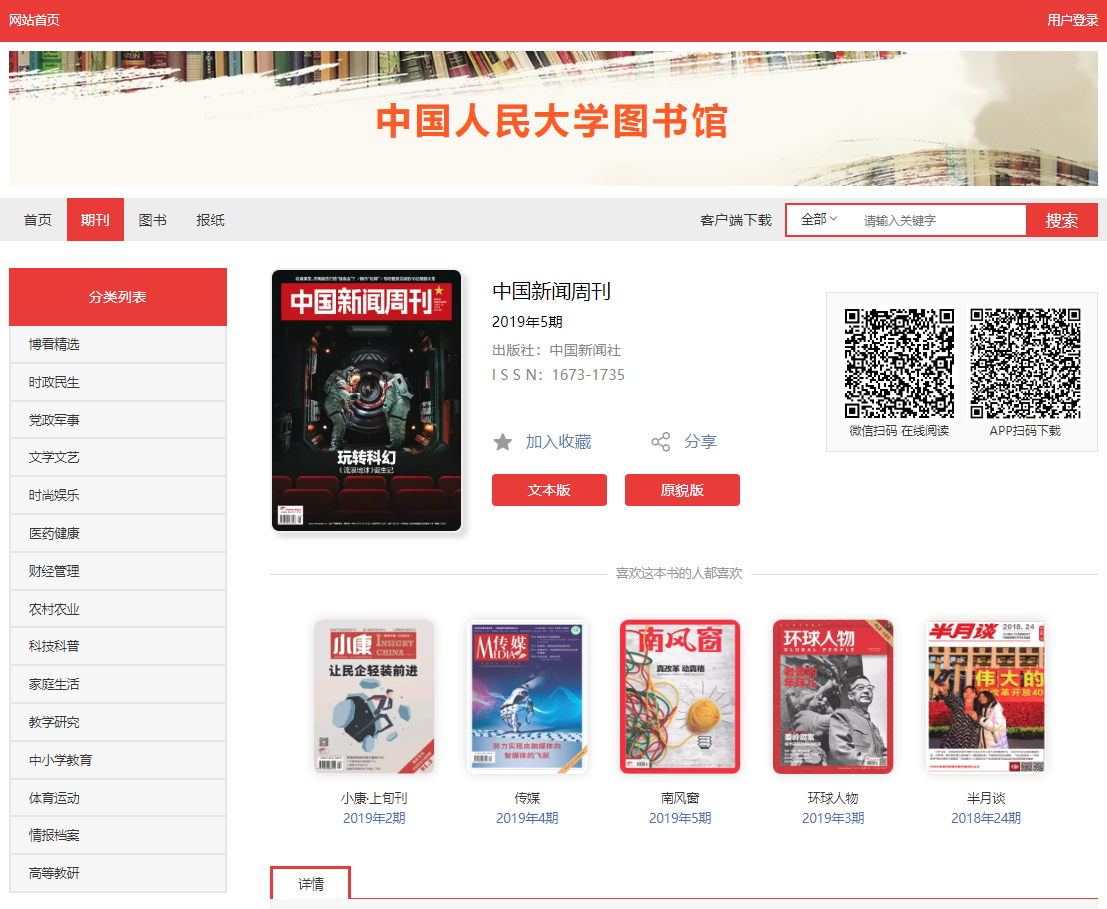 博看网人文畅销期刊数据库将人文期刊、畅销图书、主流报纸内容进行专业化、数字化的加工处理之后,以最精美的阅读形式呈现给读者。以逐一签约、正版授权的期刊、图书、报纸、听书为核心资源,共38万余册,总存储量21TB,资源还在不断增加中。且作为目前全球第一中文报刊网,收录了4000多种畅销期刊杂志,我们经常订阅的杂志几乎囊括其中,每天更新100-120本期刊,每年可以增加20000本以上。新刊上线时间基本上与纸版期刊上市时间同步。所有的过刊也仍然都保存在网站上,可以采取与现刊同样的方式阅读,欢迎大家使用!