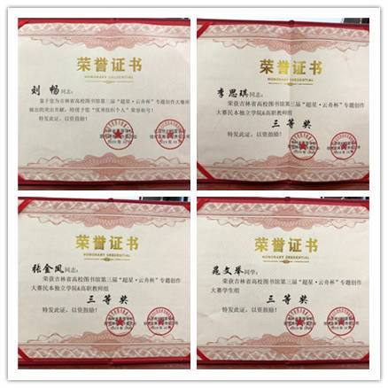 本次大赛面向吉林省各高校图书馆征稿,我校图书馆热情响应、积极参与,并组织号召全校师生参赛,共提交50多个专题作品。图书馆在本次大赛上获得优秀组织单位奖;图书馆刘畅老师获得优秀组织个人奖;图书馆张金凤、李思琪老师获教师组专题创作三等奖;我校学生晁文举同学获学生组专题创作三等奖。