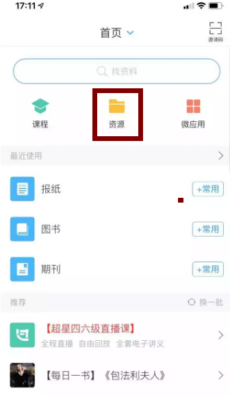 学习通首页点击“资源”项。