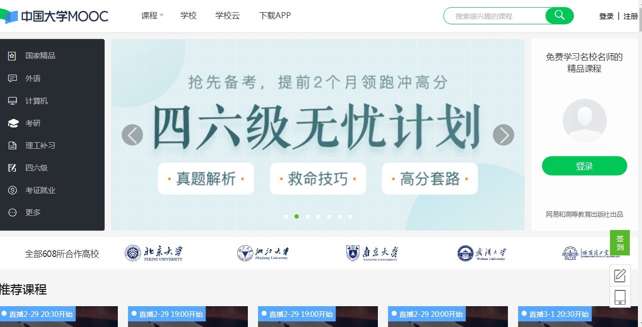 简介:中国大学MOOC是由网易与高教社携手推出的在线教育平台,承接教育部国家精品开放课程任务,向读者提供中国知名高校的MOOC课程。平台运行课程8000余门,其中国家精品在线开放课程916门,课程覆盖本科12大门类的所有专业类,其中121所双一流高校开设课程3915门,一流大学建设高校系列、一流学科建设高校系列、行业特色院校系列、特色专题系列等130余个。每门课程在MOOC运行学期都有课程建设高校的教学团队提供教学服务支持,辅导和帮助读者学习。