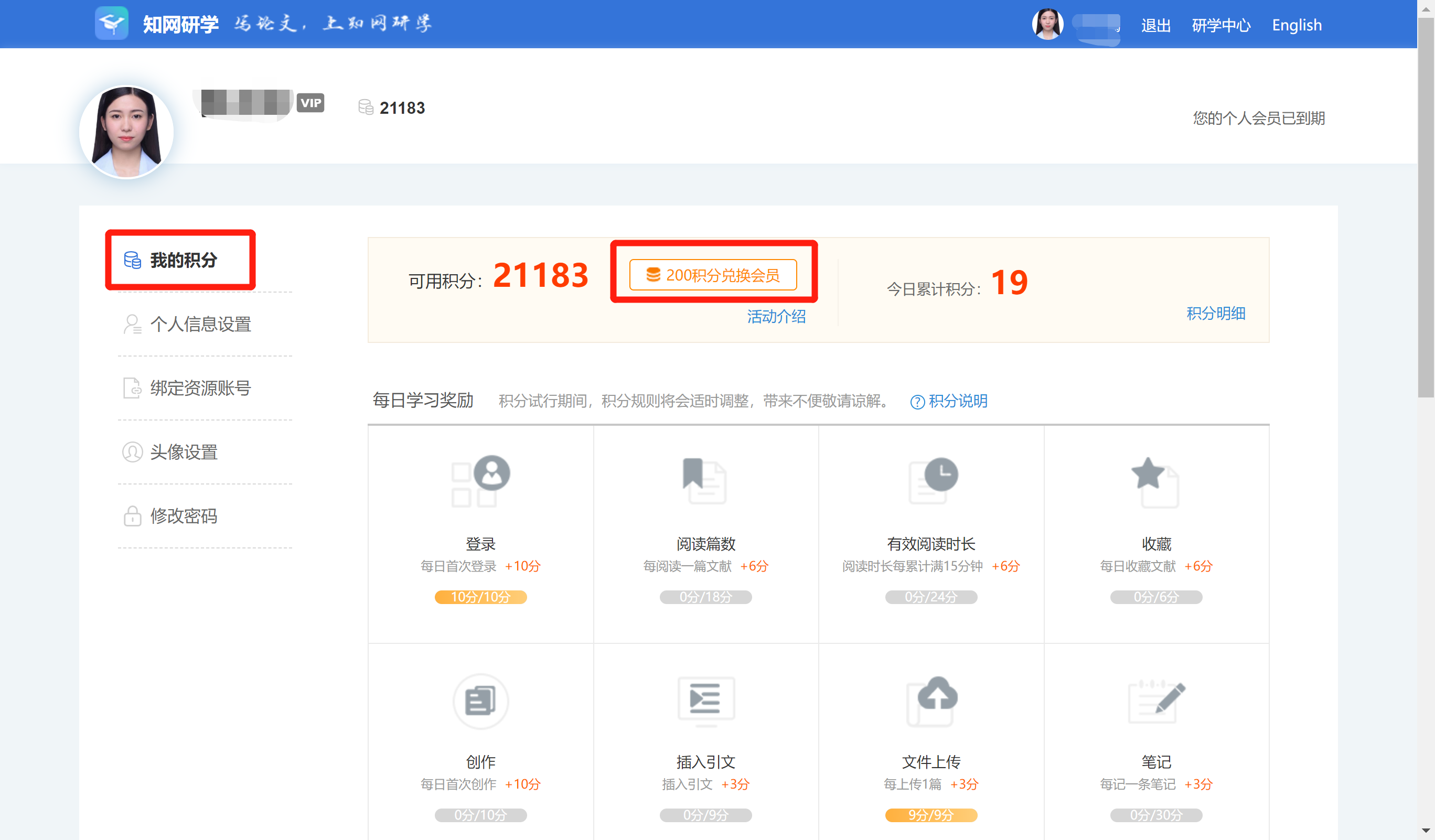 3.老用户:已经领取过14天会员的用户,可以点击右上角头像,点击“我的积分”,使用积分兑换会员。
