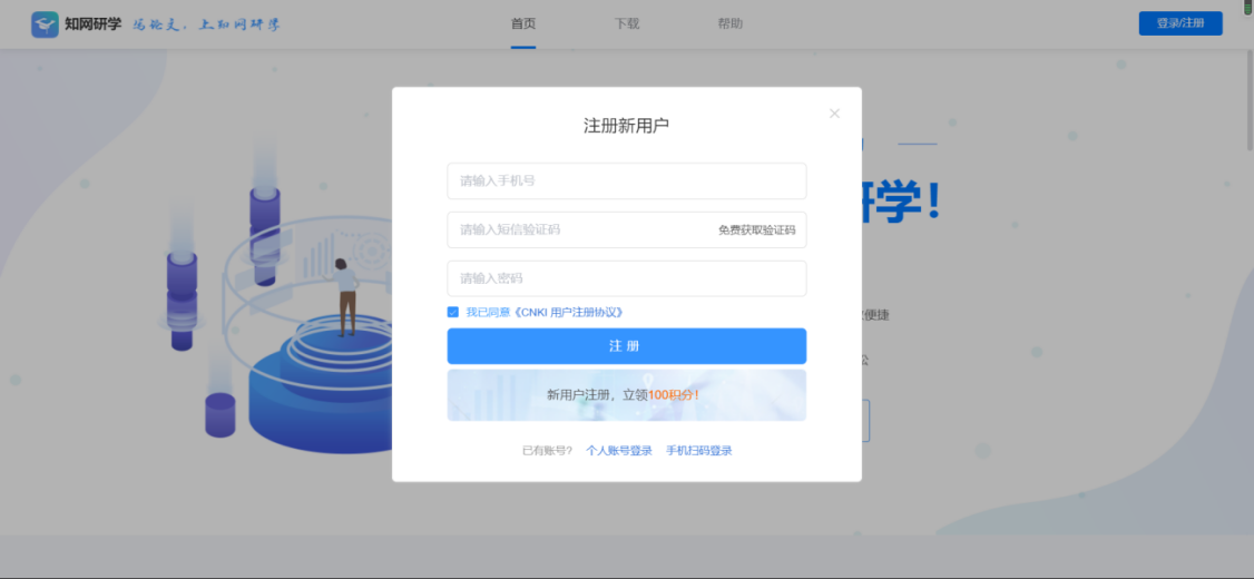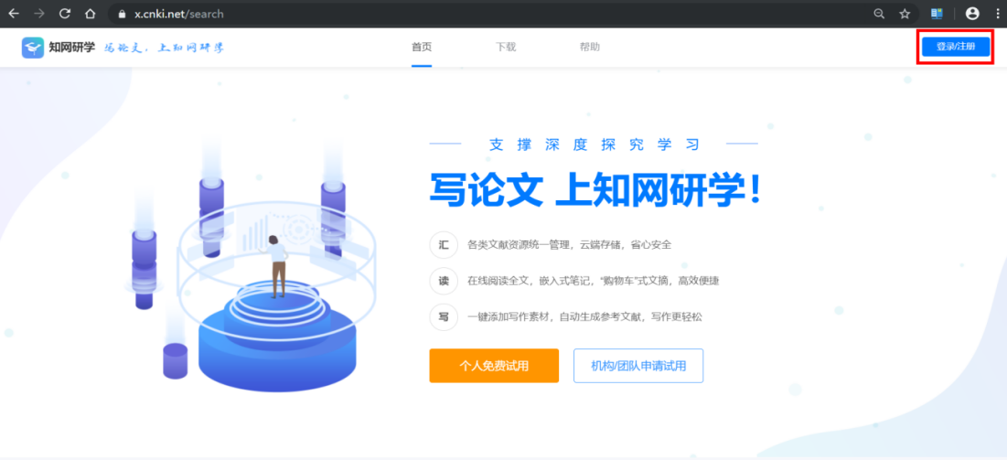 方式二:打开知网首页(cnki.net),点击红框内“研究型学习平台”注册账号即可。如果已经在知网注册过个人账号,可直接登录。