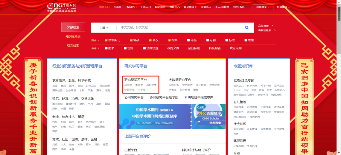 1.通过“中国知网”(cnki.net)首页,点击“研究型学习平台”,直接跳转到知网研学平台,如下图所示: