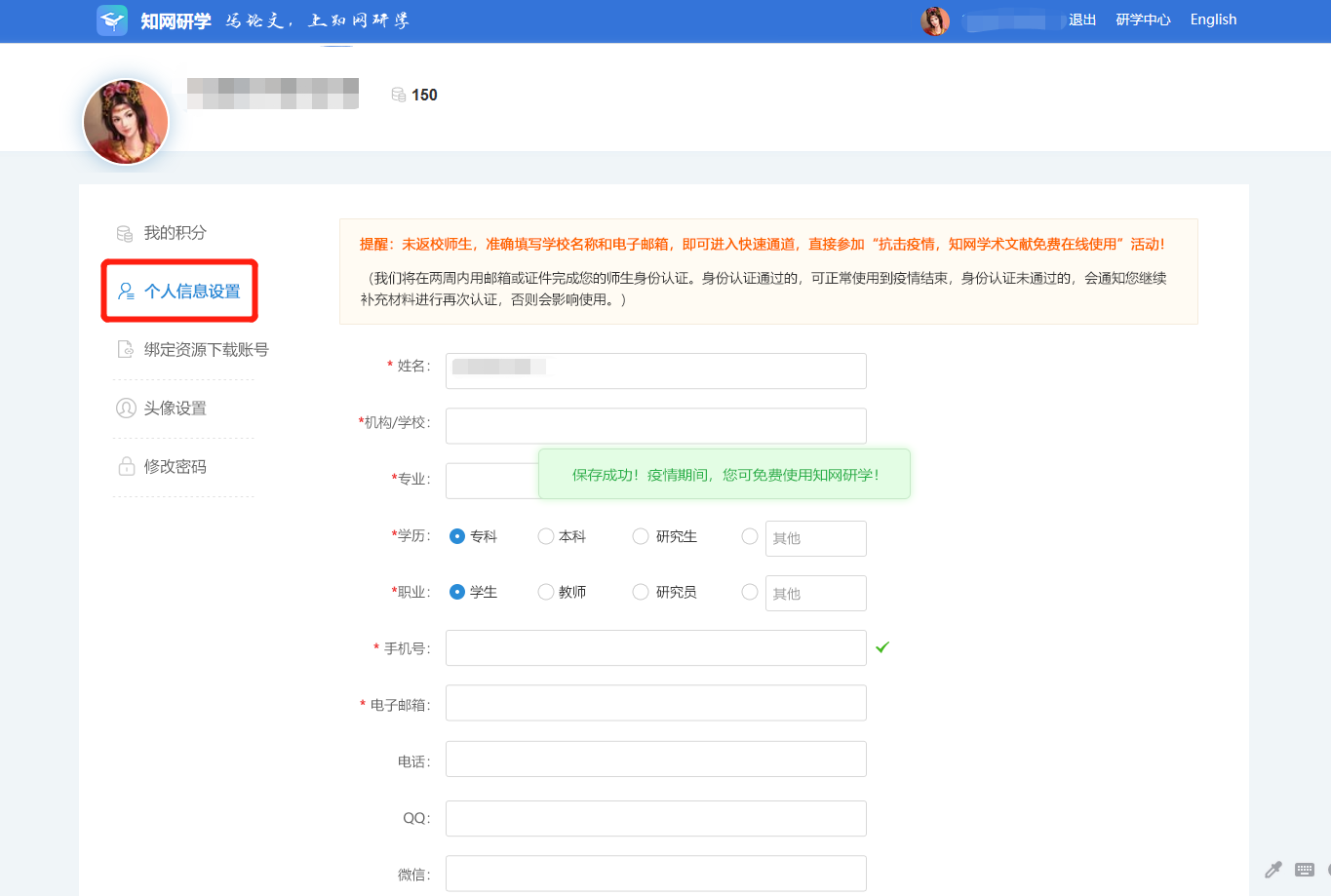 1.未返校师生:点击“马上完善信息”,在左侧“个人信息设置”中,准确填写学校名称和电子邮箱,进入快速通道。