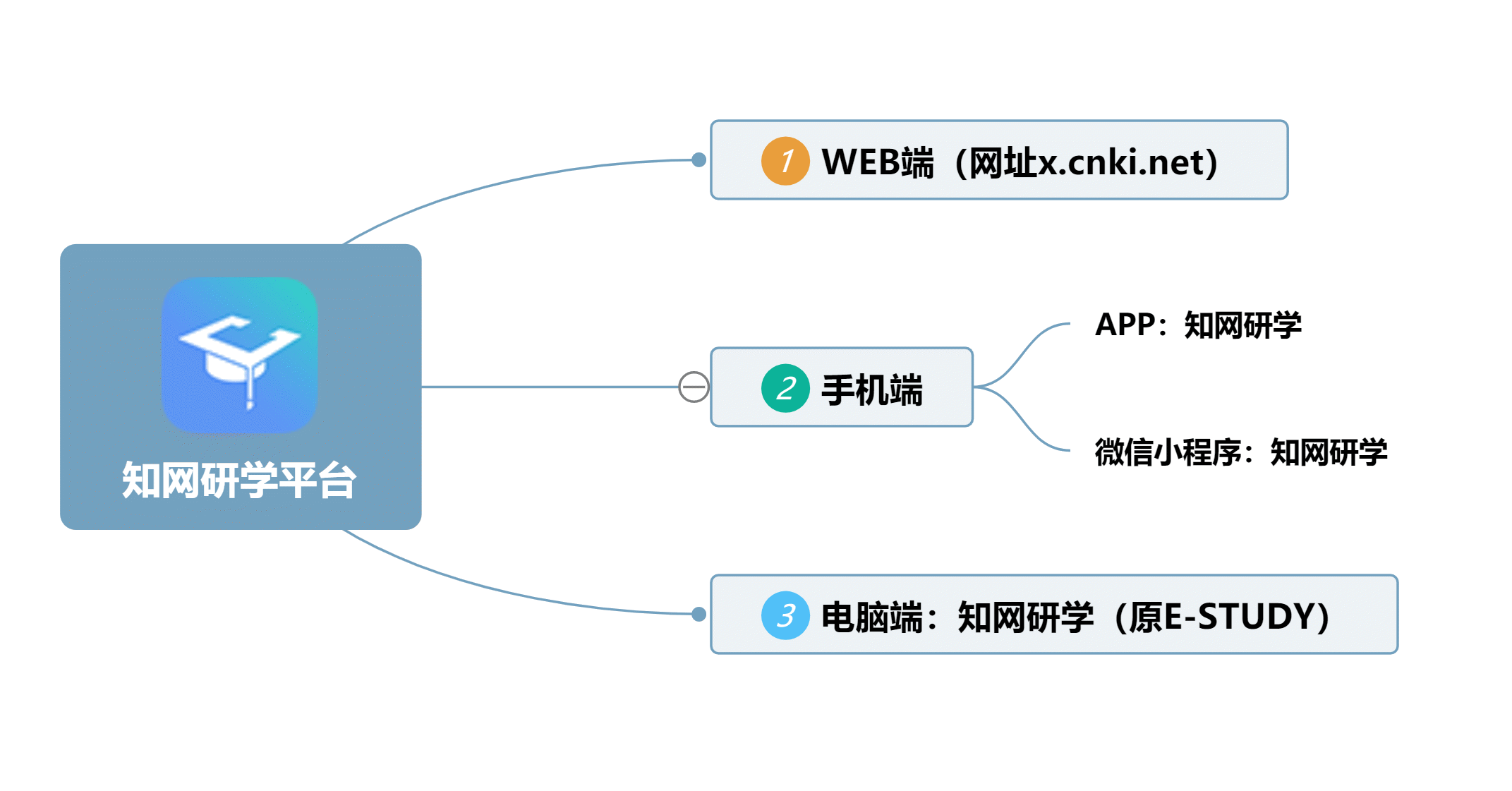 知网研学平台可进行三端服务,包括Web端(x.cnki.net)、PC端“知网研学”(原E-study)、手机端(APP、微信小程序“知网研学”)。
