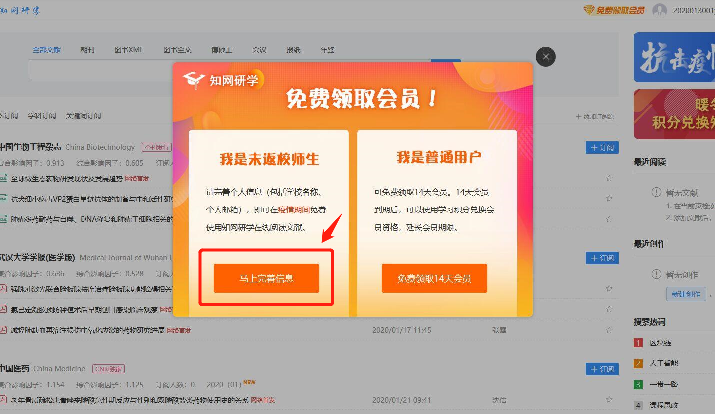 简介:即日起,全国未返校师生完善个人信息,即可领取免费会员,包括本科院校、职业院校、中小学的老师和学生(每日可在线阅读20篇论文)。