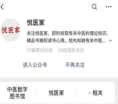 用户连接已授权的机构网络,使用个人微信搜索“悦医家”并关注,在“悦医家”菜单栏处,进入“中医数字图书馆”,完善个人信息即可使用。