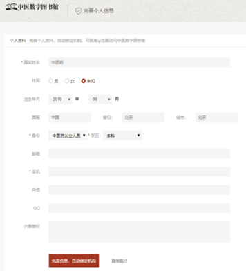 首次登录成功后,系统会提示用户完善信息,绑定机构。