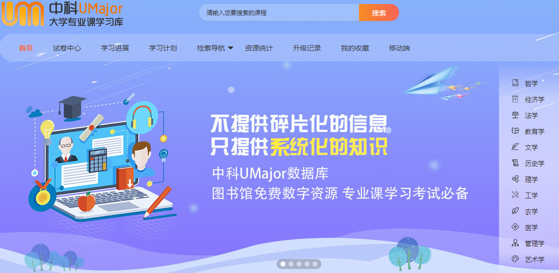 《中科UMajor专业课库》收录理学、工学、经济学、管理学、文学、法学、医学等学科的高等教育阶段专业课程1000余门,含视频课程5500+课时、同步练习试卷12万套。