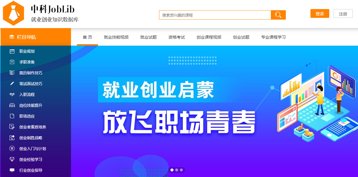 《中科JobLib就业创业总库》收录就业指导、就业能力测评、就业大数据、简历与面试指导、创业指导、创业测评等模块的视频课程1万课时。