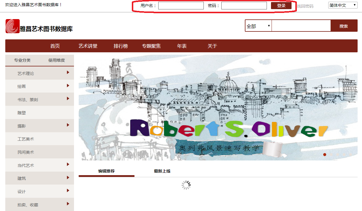PC或者移动设备登录链接地址:http://ysts2.artron.net自适应显示主页。在上图红图区域输入假期漫游账号(账号:B050001, 密码: B050001)登录即可使用全库资源。