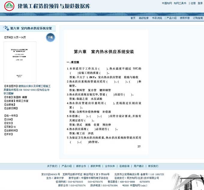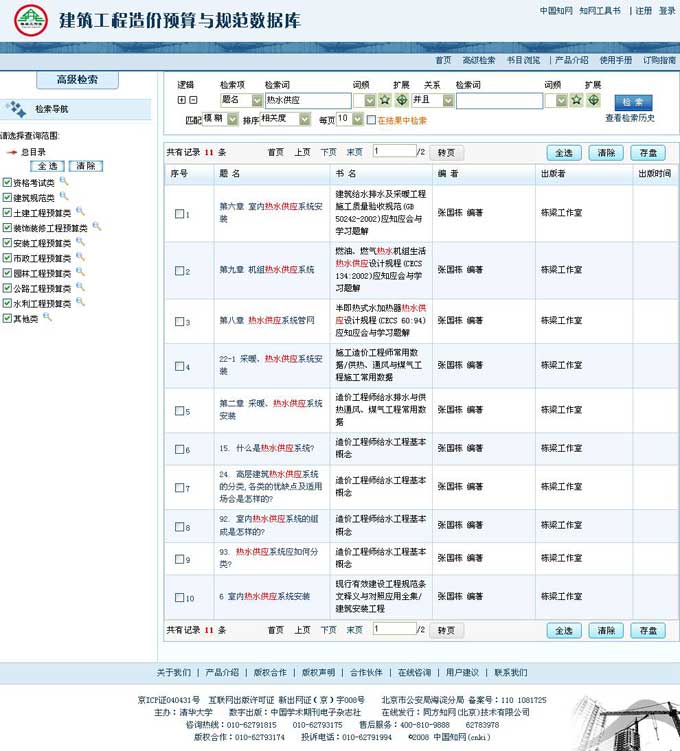 1) 检索题名=“热水供应”,得到的结果是题名中包含“热水供应”的章节。
