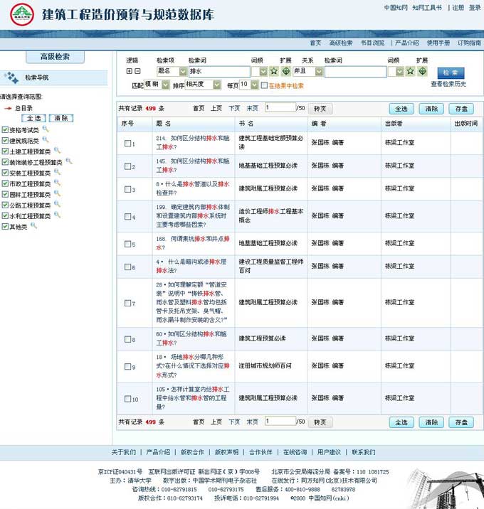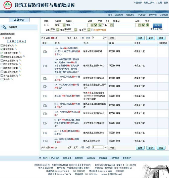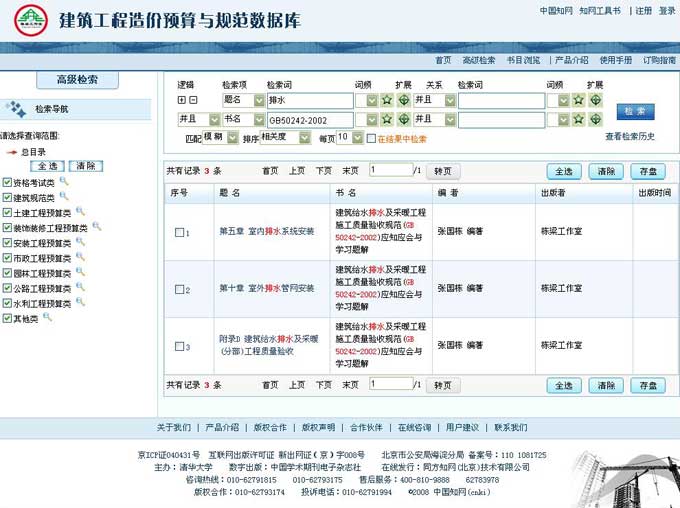 3) 仅选择“建筑规范类”、“土建工程预算类”和“装饰装修工程预算类”,检索题名=“排水”。
