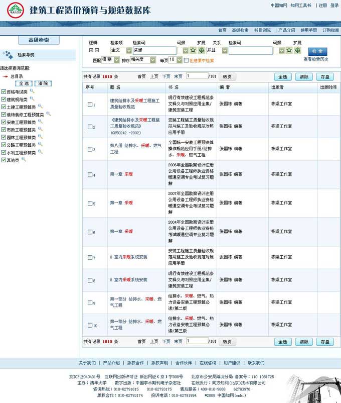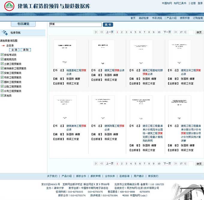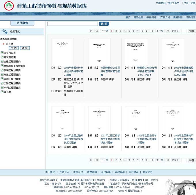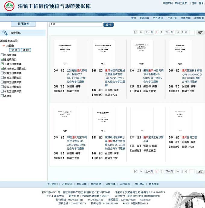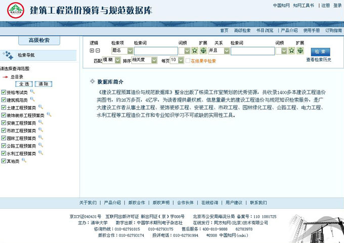 提供建筑专业的检索导航,可以选择部分分类执行检索;还可以通过点击分类进行书名浏览。